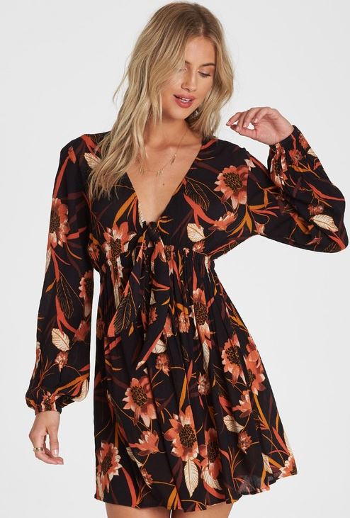 A dress with lines that live for today, this carefree mini flaunts a flowy silhouette and feminine blooms. A romantic at heart, the long sleeve mini dress is finished with a tie at the center front neckline and elastic at the empire waist and at the sleeve cuffs.