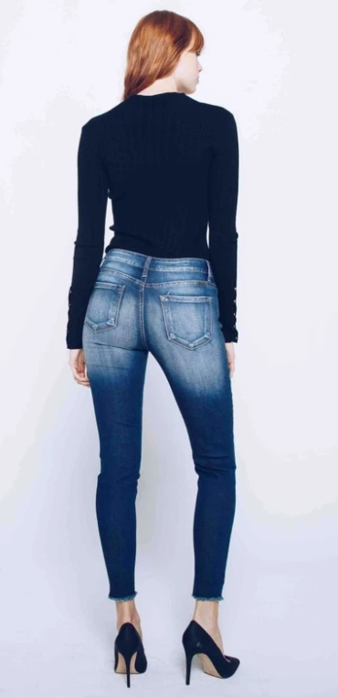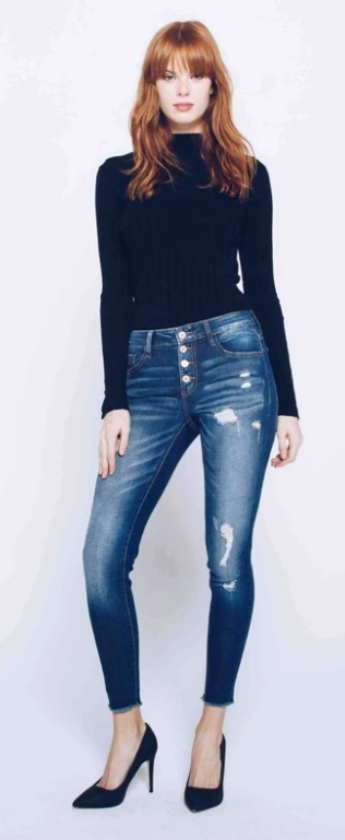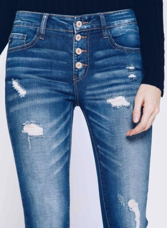 Any stylish woman would love to own a pair of denim skinnies. This is the perfect one to own. Dark wash skinny fit. Chic denim wash with right amount of distressed. Very fashionable 4 button jeans.