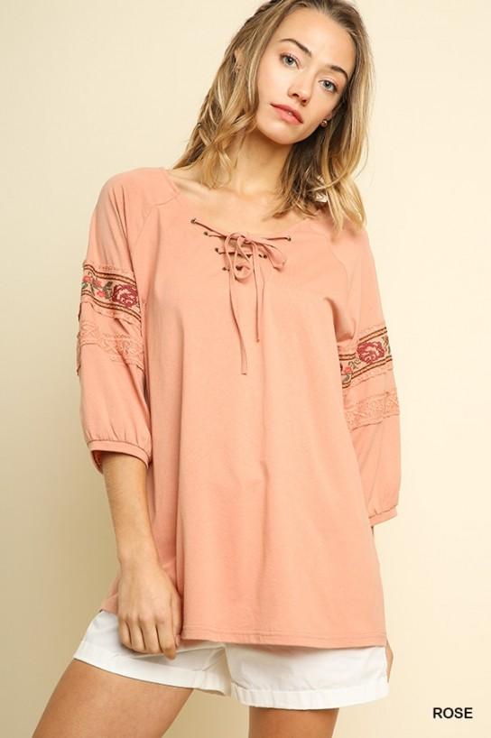 Embrace your inner flower child with this floral embroidered 3/4 puff sleeve top with lace drawstring neckline and crochet details.