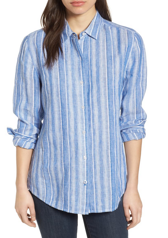 This lightweight linen-blend shirt in relaxed, beachy stripes is fashioned with a neat point collar and long, rollable sleeves.