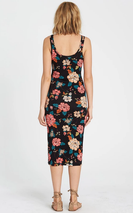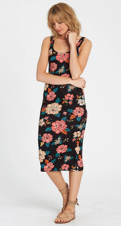 Form-fitting Scoop neck Sleeveless Pattern: floral print Shoulder to hem (HPS) length: 45 inches for size medium Material: stretch knit - 96% rayon, 4% elastane