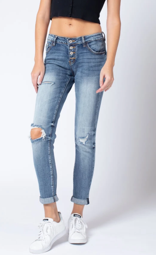 Anyone can’t go wrong with skinny jeans. Perfect item for your casual closet. High waist light wash that is almost whitish. Features a hole one knee. So stylish ankle cut fit. For more casual look pair it with rubber shoes and tee.