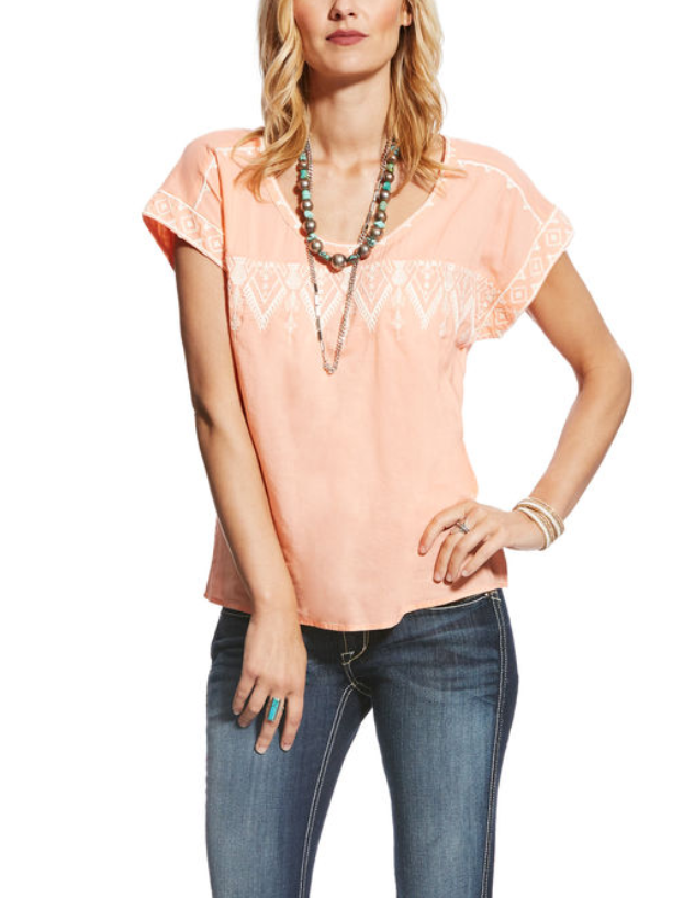 The sweet peach hue and lovely embroidered details along the front and sleeves will make this top a springtime favorite. The lightweight cotton/blend fabric is ideal for warm temps. •Cotton/viscose •Embroidered detailing •Great for layering